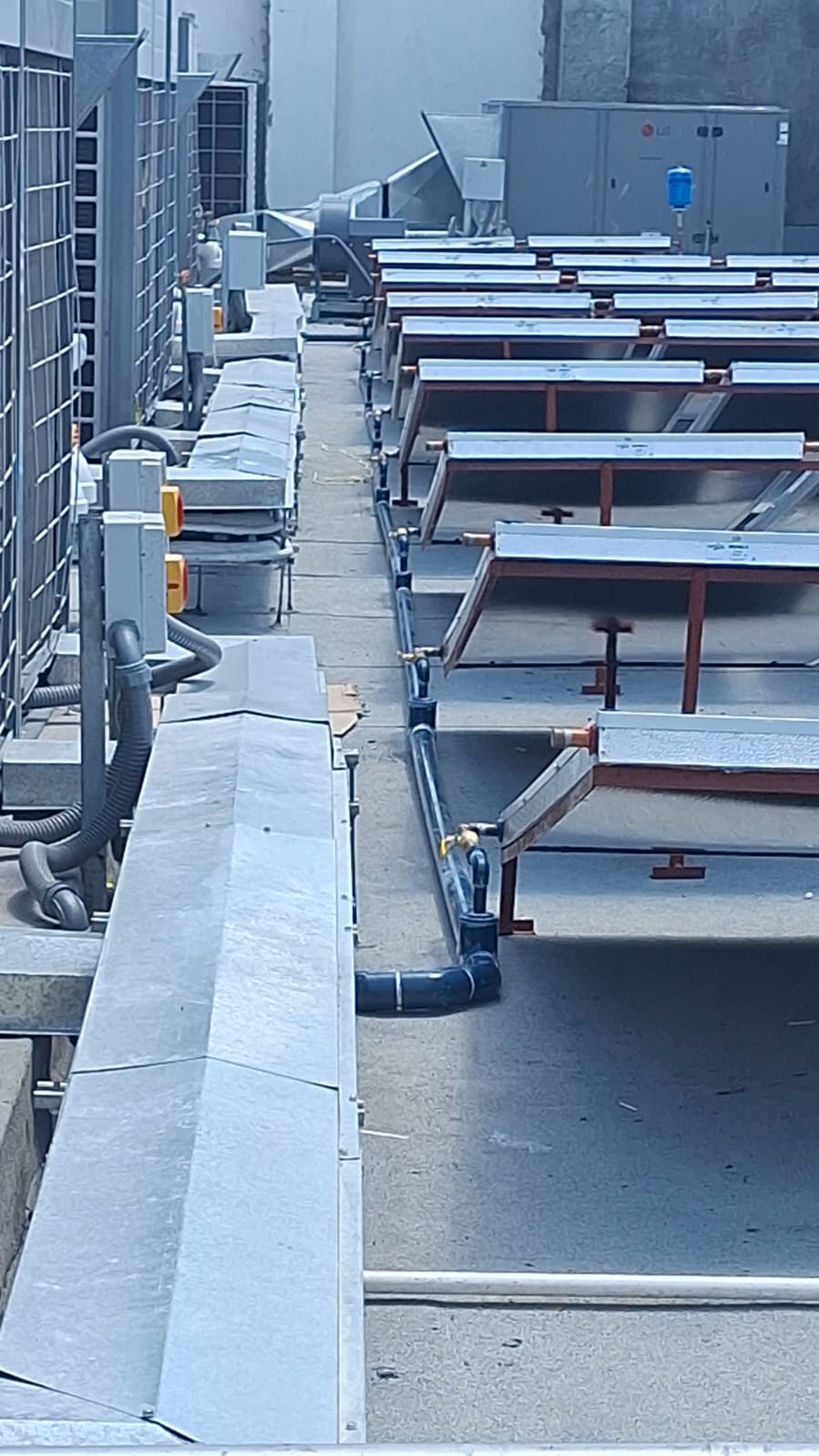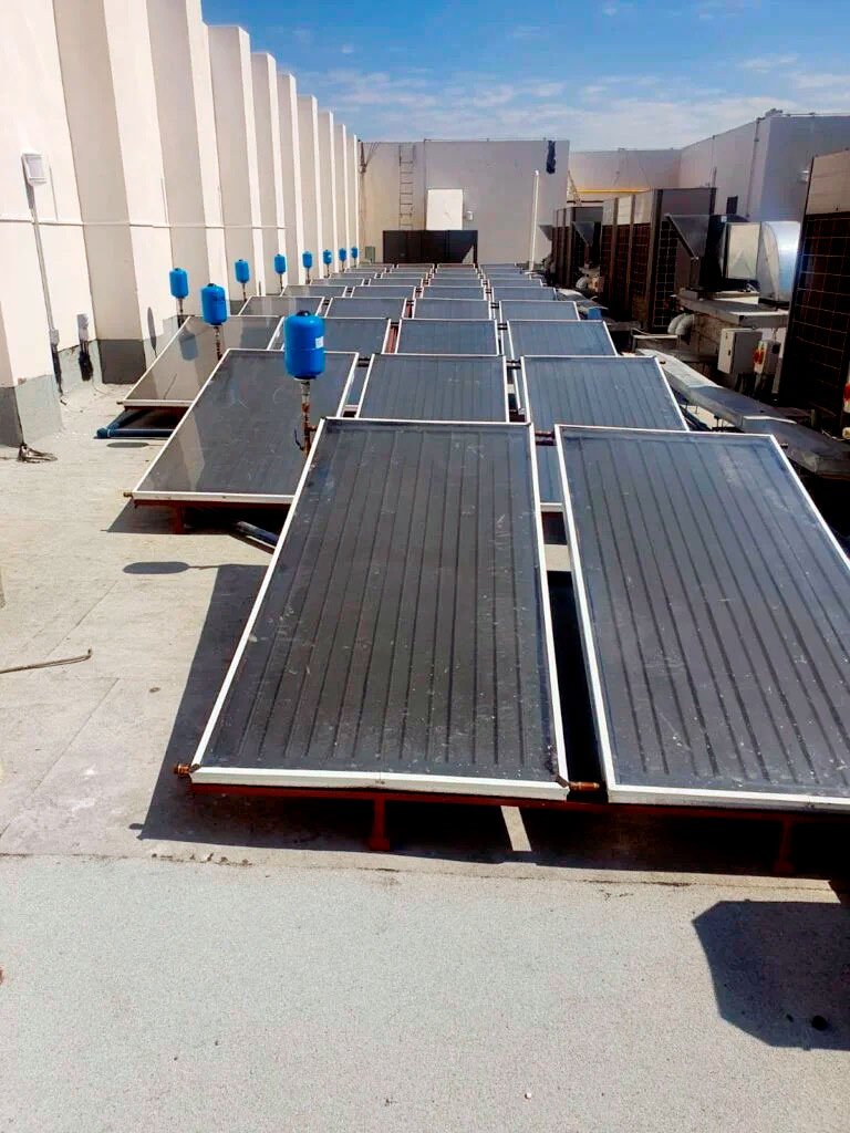 La instalación cuenta con 33 paneles  metálicos de 2m2 de superficie captadora de radiación solar, en bancos de 3 a 4 paneles, dado el espacio disponible en azotea.